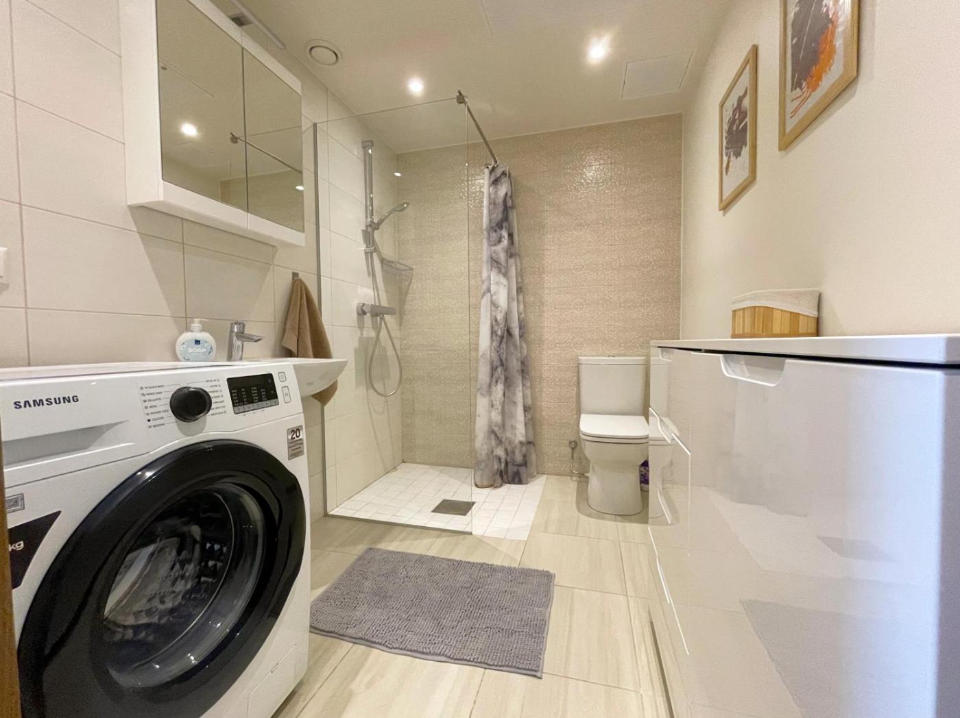 One-Bedroom Apartment. The air-conditioned apartment has 1 bedroom and 1 bathroom with a shower and a hairdryer. In the well-fitted kitchen, guests will find a stovetop, a refrigerator, kitchenware and an oven. There is a washing machine, soundproof walls and a terrace and complimentary winechampagne is offered for guests. The unit has 1 bed.