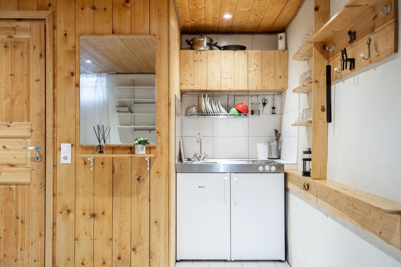 One-Bedroom Apartment. The well-equipped kitchenette has a stovetop, a refrigerator, kitchenware and a microwave. The apartment features a flat-screen TV with cable channels, a washing machine, a tea and coffee maker and heating. The unit has 1 bed.