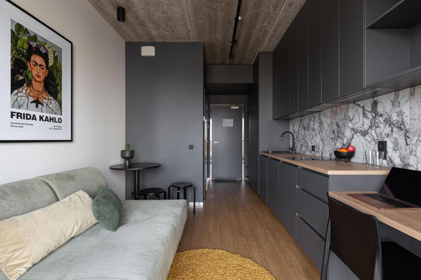 Studio. This apartments kitchen has a stovetop, a refrigerator, kitchenware, and an oven. This studio features a private bathroom, a wardrobe, an electric kettle, and a terrace. The unit has 1 sofa bed. ;